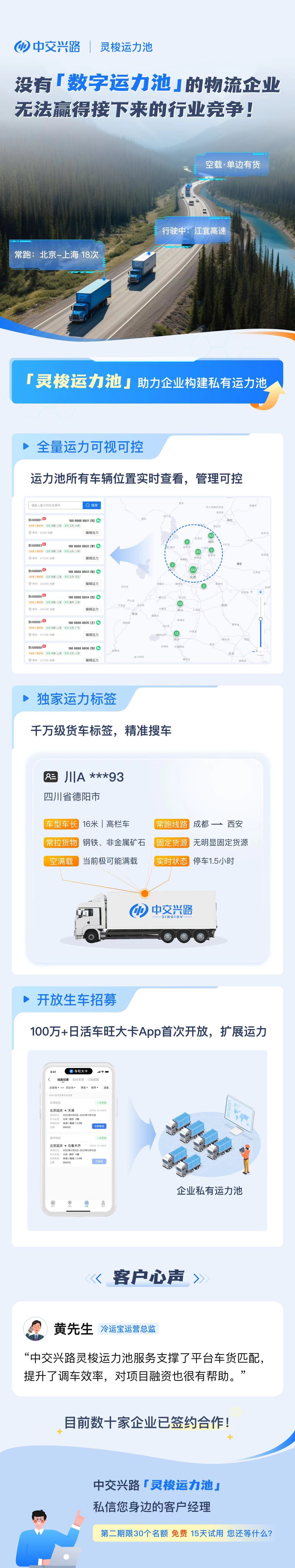 充分认识到这一挑战,基于货运大数据底座和灵梭算法引擎,在货物、司机、车辆、路线等多维度数据的基础上,实现运力的智能推荐和连接,解决物流企业匹配运力效率低下的问题,快速为物流企业推荐最适合的车辆。同时,让这些运力由线下变成线上可视化的数字资源,使物流企业不断积累、持续复用。此外,平台集成的“灵动”引擎可实现基于运单的在途管理和异常监控,为物流企业、货主企业的货物在途管理提供强有力支撑,大幅降低运输风险。